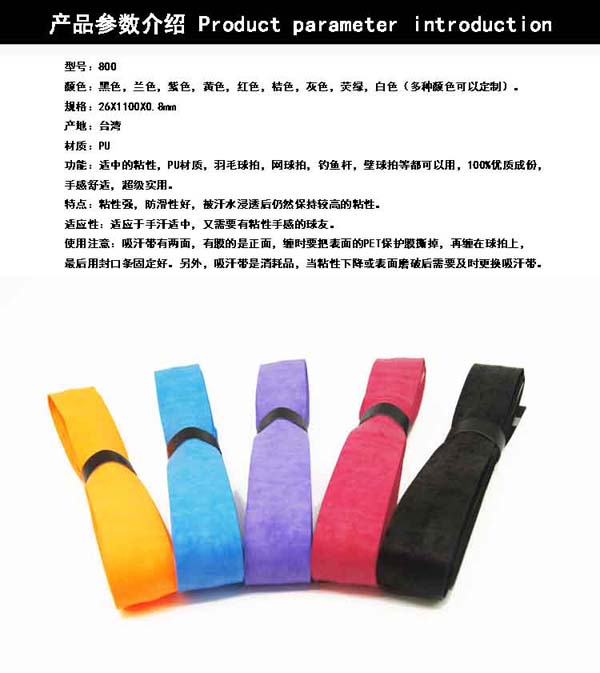 使用注意:吸汗帶有兩面,有膜的是正面,纏時要把表面的PET保護膜撕掉,再纏在球拍上,最后用封口條固定好。另外,吸汗帶是消耗品,當粘性下降或表面磨破后需要及時更換吸汗帶。