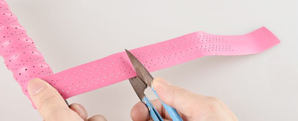 一般吸汗帶寬度25mm每次壓1/3合適,都可以完全纏繞到拍柄上端,最后準備好附帶的膠帶,撕開最開始留下的膠帶,把吸汗帶末端用膠帶纏繞至不會散開。